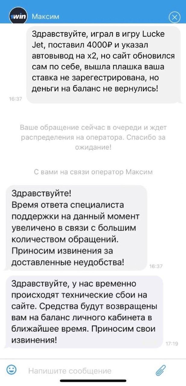 После того как проиграли переходим в поддержку и пишем следующее сообщение «Здравствуйте, играл в игру Lucky Jet, поставил сумму(пишите свою сумму которую ставили) и указал автовывод на х2, но сайт обновился сам по себе, вышла плашка ваша ставка не зарегестрирована, но деньги на баланс не вернулись» не обязательно один в один. так как 1win сделан на зеркалах такое действительно может происходить.